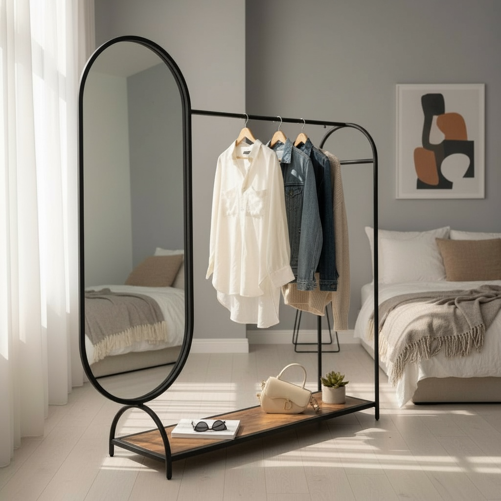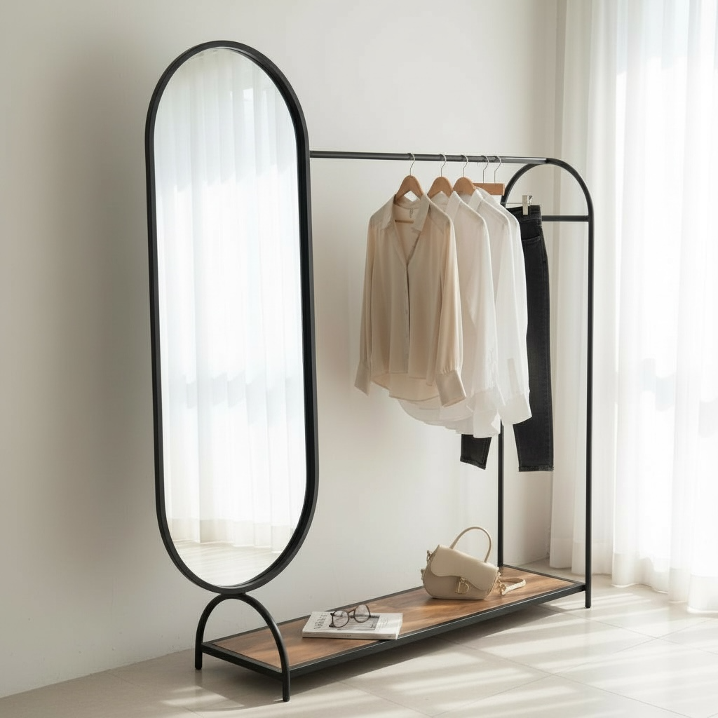 این رگال با طراحی خاص و ترکیب آینه قدی و رگال لباس در یک ساختار یکپارچه، علاوهبر نگهداری لباس، امکان مشاهده استایل و ظاهر را نیز فراهم میکند.