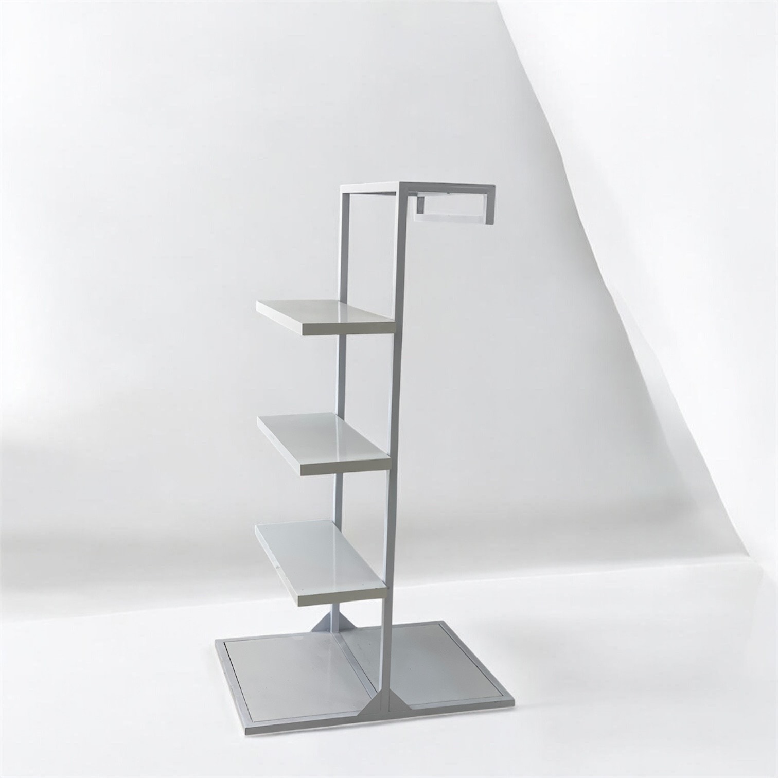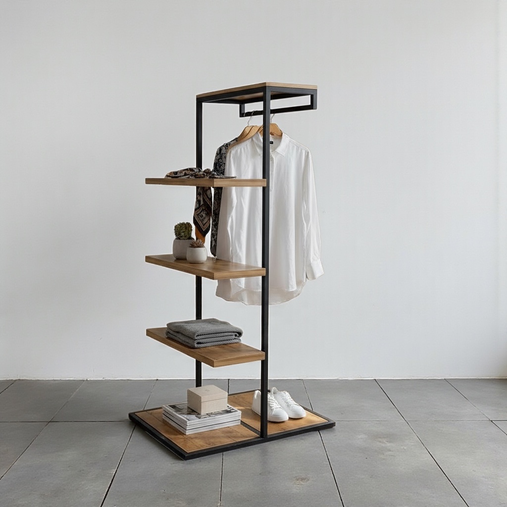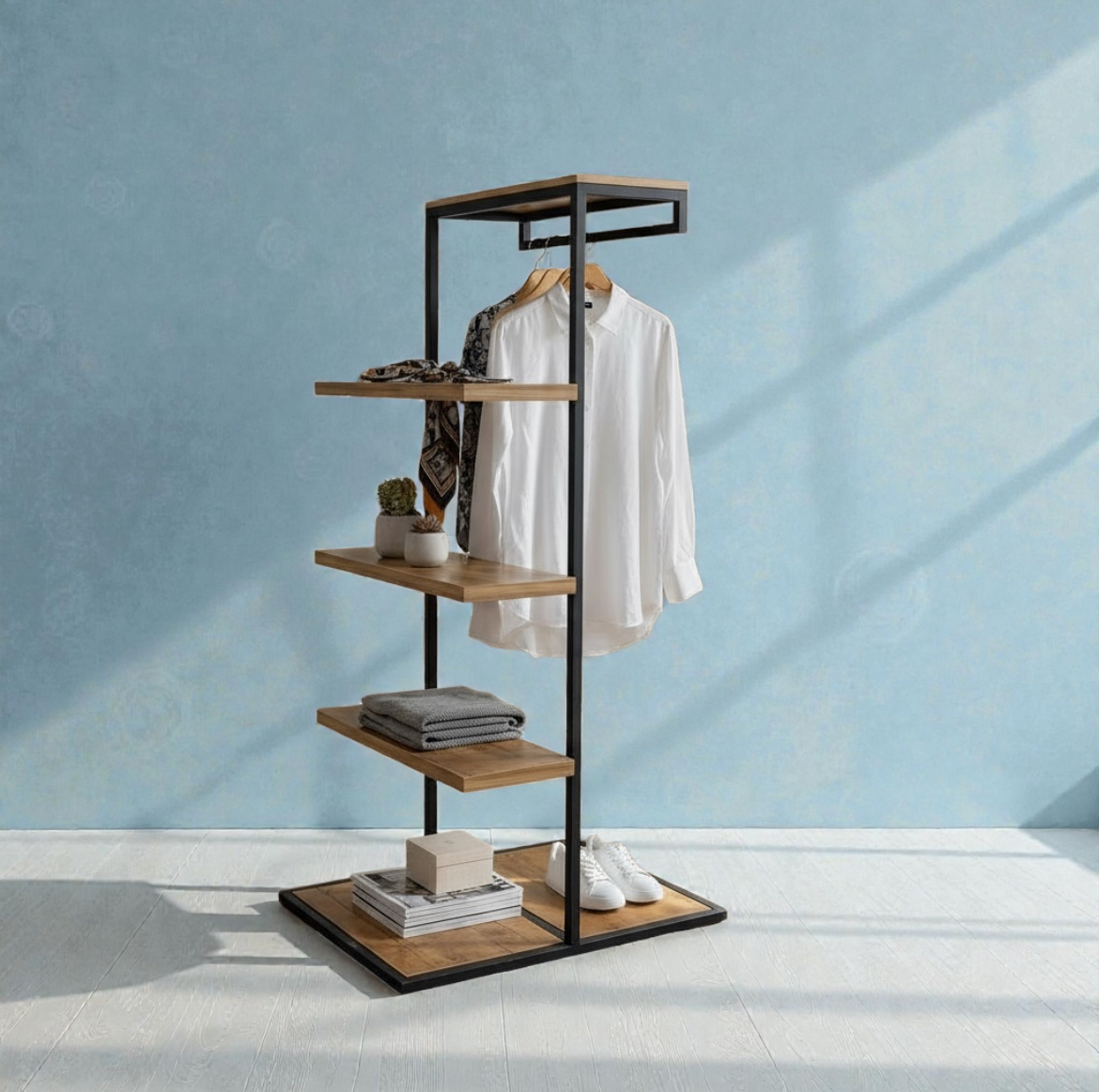 این رگال فلزی با رنگ مشکی مات، دارای ۳ طبقه مقاوم برای قرار دادن کیف، کفش و لوازم تزئینی بوده و در قسمت بالایی آن، میتوانید چند دست لباس را به زیبایی آویزان کنید.