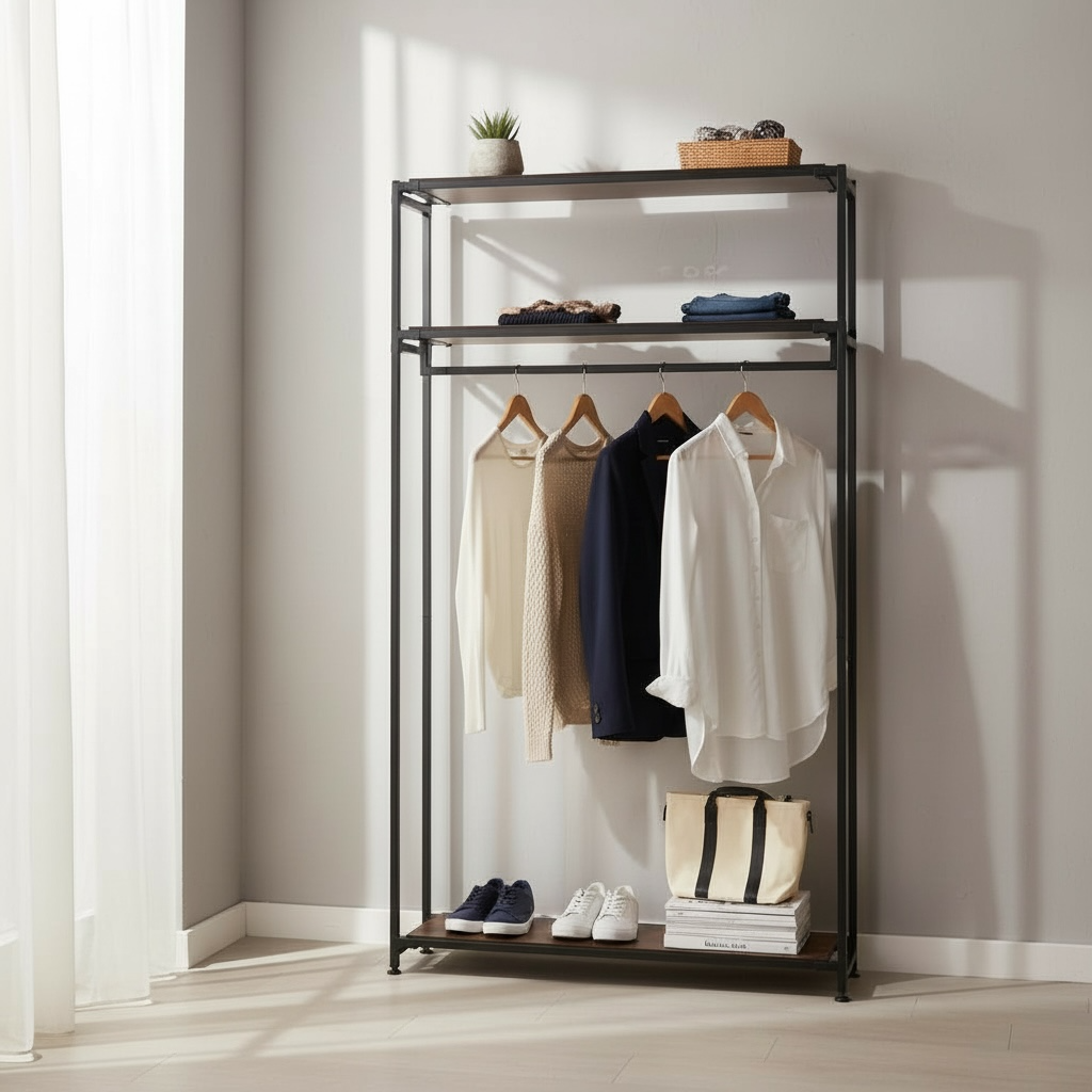 رگال لباس ایستاده سهطبقه با طراحی ترکیبی چوب و فلز یکی از کاربردیترین مدلهای رگال است که علاوه بر بخش اصلی آویز لباس، دارای دو طبقه چوبی در قسمت بالا و یک طبقه چوبی در پایین میباشد. این طراحی هوشمندانه باعث میشود فضای کافی برای قرار دادن کیف، کفش، اکسسوری یا حتی وسایل تزئینی در اختیار داشته باشید.