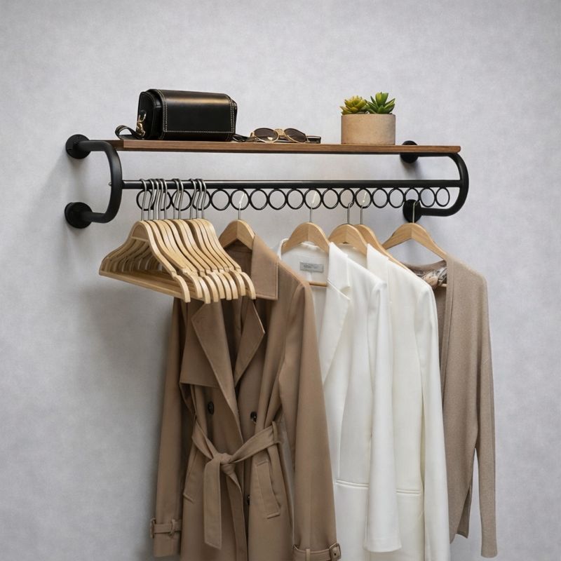 این رگال دیواری مجهز به طبقهی چوبی مقاوم در قسمت بالایی است که میتوانید وسایلی مانند کیف، کلاه، لوازم دکوری یا سایر اکسسوریها را روی آن قرار دهید.