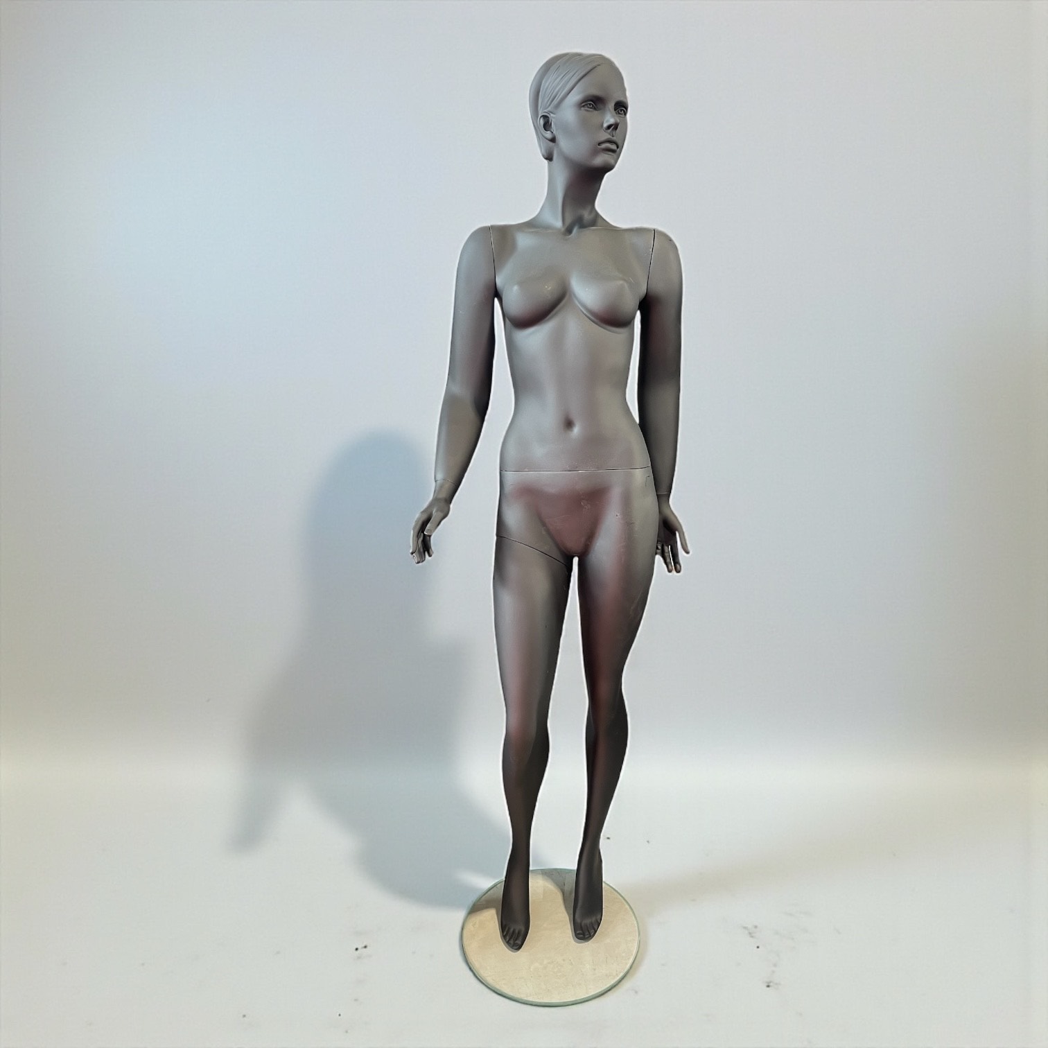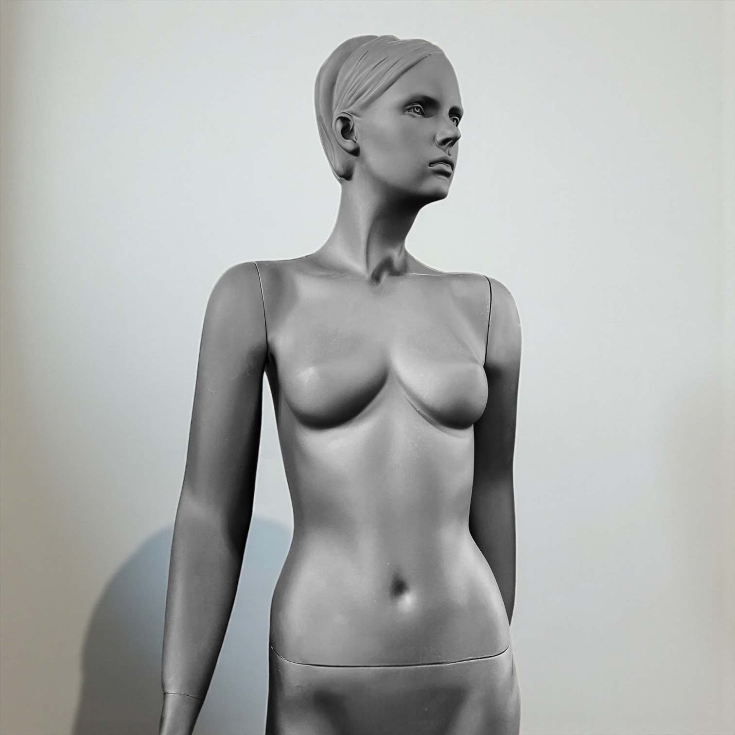 رنگ مشکی مات انتخابی هوشمندانه در طراحی این مدل مانکن است. رنگ مشکی باعث میشود تمامی رنگهای لباس روی مانکن بهتر دیده شوند و کنتراست رنگی خوبی ایجاد شود. علاوه بر این، سطح مات مانکن از انعکاس نور جلوگیری میکند و در نورپردازی ویترین جلوه بسیار زیباتری ایجاد میشود. همین موضوع باعث میشود در عکسبرداریهای حرفهای نیز نتیجه کار به مراتب بهتر و شکیلتر باشد.
